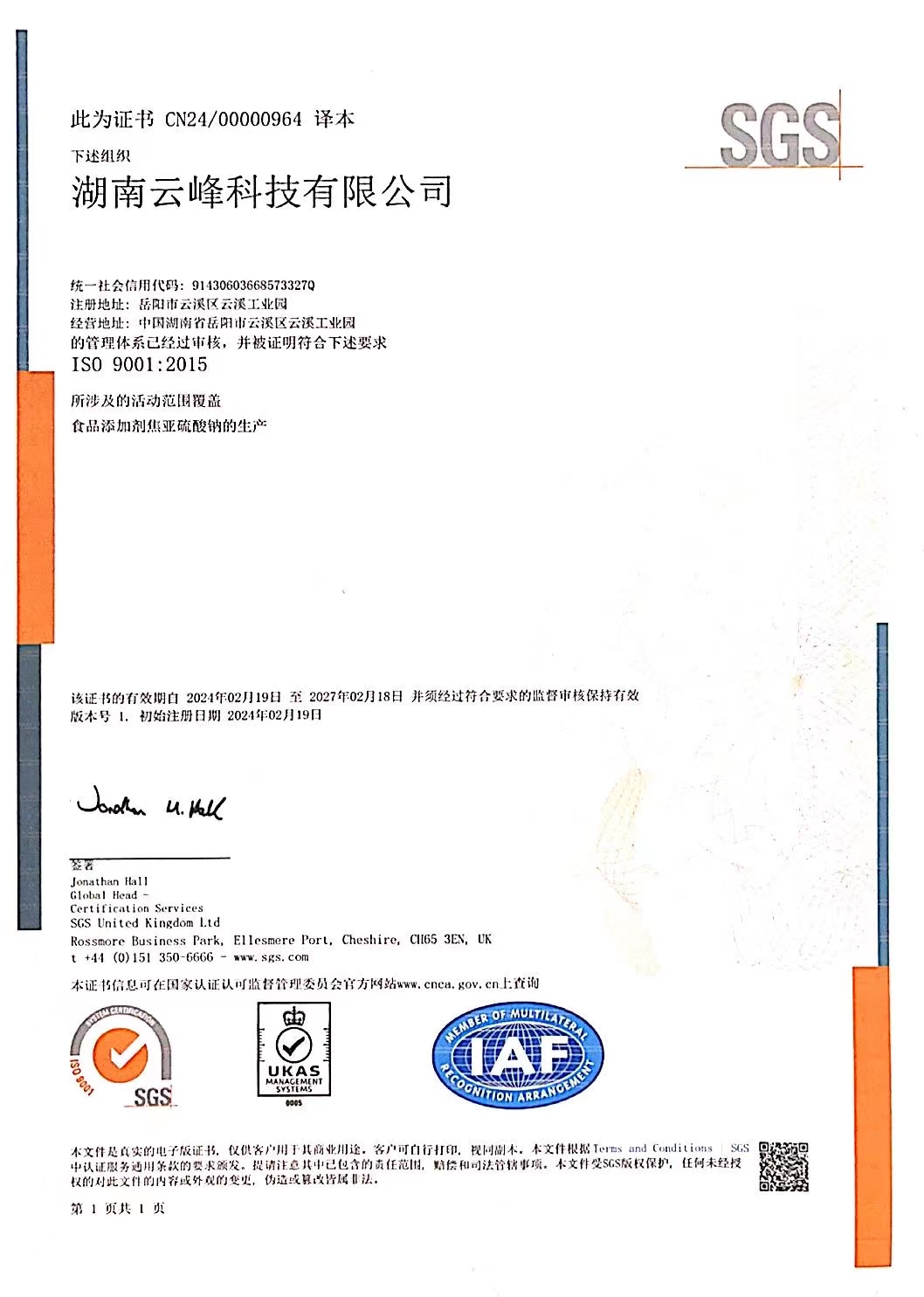 湖南云峰科技有限公司(以下簡稱云峰科技),是由長沙湘岳化工責任有限公司全額投資以生產焦亞硫酸鈉、亞硫酸鈉等亞硫酸鹽為主營業務的高科技企業,具有六十多年的生產歷史,同時也是焦亞硫酸鈉的國家標準制定參與者。在行業內具有很大的影響力?,F有職工八十余人。具有優良的經營管理團隊和成熟的生產技術隊伍。由多位在化學、化工行業擁有豐富工作經驗的工程師及技術員團隊組建而成,致力于亞硫酸鹽產品的研發、生產和銷售。2020年公司對生產設備、安環設施及工業技術等進行了大規模的升級改造,使焦亞硫酸鈉和亞硫酸鈉的生產工藝更加先進,技術更成熟,產品質量更優良。無論在生產工藝、設備、產品質量、清潔生產、節能環保和員工素質方面,均處于行業領先地位。公司的主導產品“云峰”牌焦亞硫酸鈉,歷史悠久,深受國內外客戶信賴,產品遠銷東南亞、歐美、非洲、南美洲等20多個國家和地區,產品供不應求。